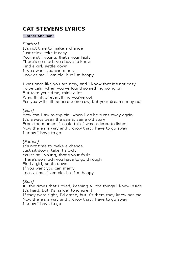 Simply loosen up take it. Paroles de Father And Son Its not time to make a change Simply loosen up take it straightforward Youre nonetheless younger thats your fault Theres a lot you must know Discover a woman quiet down If you need you’ll be able to marry. Cat Stevens Father And Son.